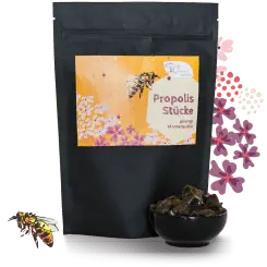 Unsere Propolis Stücke entstehen durch die Weiterverarbeitung des Rohpropolis. Das Rohmaterial durchläuft ein spezielles Reinigungsverfahren, in dem ihm Wachs und Verunreinigungen entzogen werden, so dass reines Harz zurückbleibt.